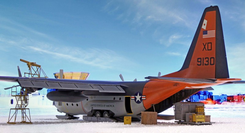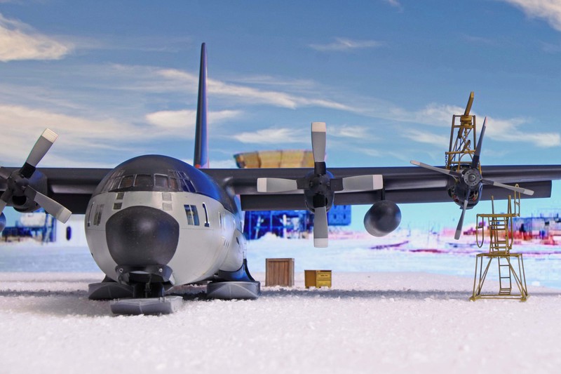 Nach dem Abtrennen der beiden Ausleger, wurden diese innen mit Spanten und Stringern versehen. Anschließend habe ich Alufolie um die offenen Enden geklebt und vorsichtig verschliffen. Nach dem Bemalen wurde die Folie mit einem Zahnstocher verbeult und an den entsprechenden Stellen Farbe abgekratzt. Die Bugbemalung wurde mit einem Pinsel aufgemalt, da Revell das Modell mit dem entsprechenden Decalbogen zu der Zeit noch nicht im Programm hatte. Die Grundplatte wurde wie üblich mit Material aus der Modellbahn Abteilung gestaltet.
